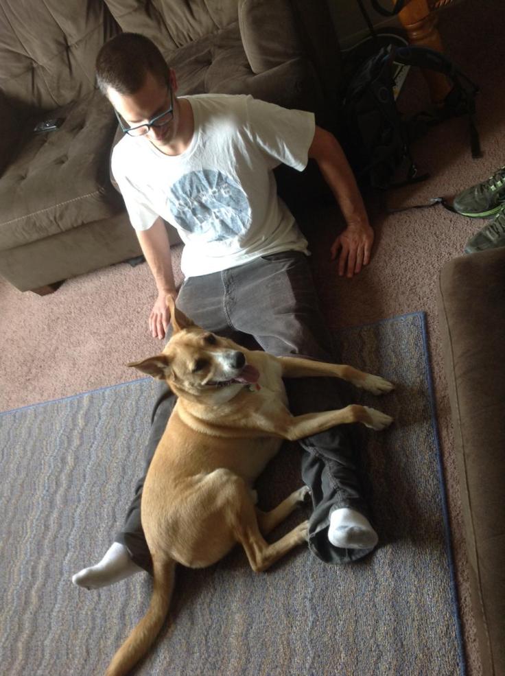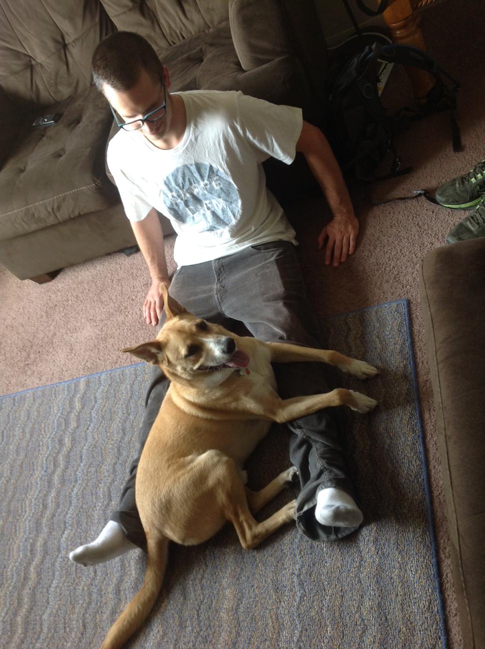 So Paul came over and Sokka just decided to come over and lay across Paul’s legs. Hilarious. They see Paul as a friend or maybe a cool uncle. Dogs are funny.