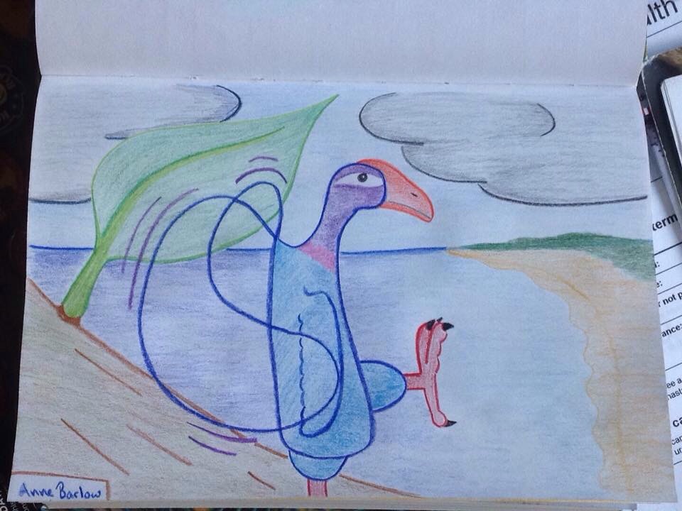 This squiggle, donated by Anne Barlow was not the first, but I especially like it because the bird that it evolved into came with an interesting story. When I say I found the story interesting, it is because I discovered the story the same way I discover the images in the squiggles. It just seemed like that was what was right. If you see me, offer a squiggle. I would love to see where your squiggle takes us.